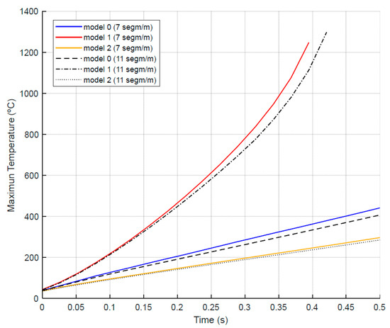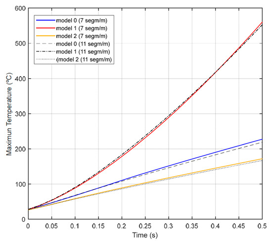 Figure 8 shows the variation over time of the maximum temperature reached by the electrode, which corresponds to one of the segments into which the rods are divided. The solid-colored lines correspond to the segmentation of 7 segments per meter, while the dotted lines represent the finer segmentation of 11 segments per meter.