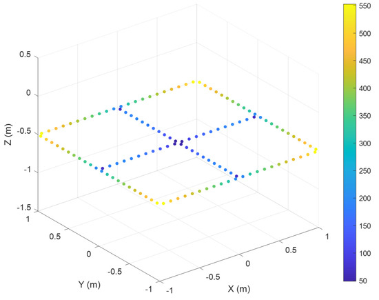 Figure 9 shows the temperature acquired by each segment of the electrode, represented by a point, at the final instant of the time period considered. As in Figure 7, this refers to the electrode with fine segmentation, using Model 1 to calculate the temperature acquired at the final instant of the process.