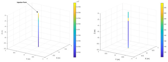 Finally, Figure 12 displays the nodal potential along the rod in the left panel, while the right panel shows the temperature of each rod segment for the partition with seven segments per meter. Both panels correspond to Model 2, which accounts for the temperature-dependent variation of soil resistivity, using a segmentation of seven segments per meter.