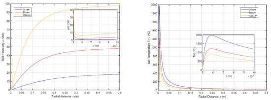The left panel of Figure 13 displays the soil resistivity profile as a function of radial distance from electrode segments located in different soil layers. The blue line corresponds to a segment within the 20 Ω·m layer, the red line corresponds to a segment in the 50 Ω·m layer, and the orange line corresponds to a segment situated in the highest-resistivity layer of 100 Ω·m, at the final time instant. The right panel shows the temperature as a function of the radial distance from the previously mentioned segments. Both panels display a zoomed-in view of the region closest to the electrode, covering the radial distance from r = 5 mm (the electrode surface) to r = 10 mm. The data shown corresponds to Model 2, which accounts for the temperature-dependent soil resistivity.