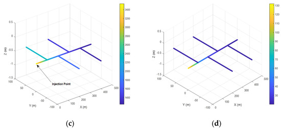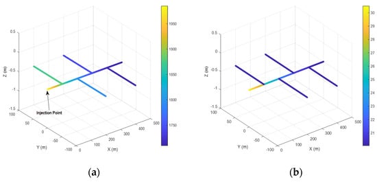 The proposed model allows for the incorporation of electrodes made from materials other than conventional copper and its alloys. This makes it possible to evaluate, from a thermal perspective, the suitability of alternative conductive materials whose implementation in grounding electrodes may offer economic advantages. As an application example, a large synthetic electrode is considered, which could represent a simplified version of the grounding electrode used in a large-scale photovoltaic installation. Two scenarios are used: one in which bare copper conductors are used, and another in which stainless steel is used instead. In both cases, the electrode conductors have a radius of 7 mm and are buried horizontally at a depth of 0.5 m in a 50 Ω·m homogeneous soil. Due to the large size of the electrode, and in order to avoid excessively long computation times, a segmentation of two elements per meter is assumed. It is acknowledged that the resulting potentials overestimate the actual values since—as is well known—refining the segmentation of the conductors leads to results that more closely approximate the real values. The same applies to temperatures: the calculated values overestimate the actual temperatures at any point on the electrode or in the surrounding soil. Figure 14 shows, in the left panels from top to bottom (a) and (c), the node potentials of the electrode made of hard-drawn copper and zinc-coated steel, respectively. Table 1 summarizes the thermal and electrical properties of both materials used in the proposed model.
