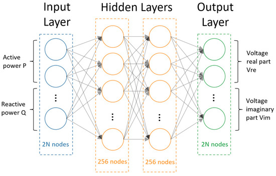 - Output Layer: The network outputs a real-valued vector of size , which is interpreted as the real and imaginary parts of the estimated complex bus voltages. Specifically, the first entries correspond to and the next entries to .