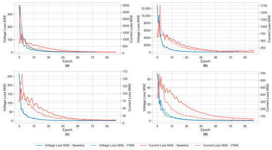 To ensure consistency across experiments, the same set of hyperparameters was used for training all models. Table 1 summarizes the key training configurations applied in this work. The models were trained using the Adam optimizer, which offers adaptive learning rate adjustment and typically ensures faster convergence for deep networks. A modest architecture was employed, consisting of two hidden layers with 256 units each and tanh activation functions, balancing model expressiveness and overfitting risk. The total dataset comprised 10,000 time-indexed samples, split into training and testing subsets using an 80–20 ratio. The learning rate was initially set to 0.01 and adjusted dynamically during training through a scheduler with a patience of 50 epochs and a reduction factor of 0.5 when no improvement was observed. Training lasted up to 2000 epochs, although early stopping was effectively managed through the scheduler. Finally, the weights of the composite loss terms—associated with voltage and current equations—were set empirically, with λ values on the order of 0.001 to balance physical consistency and prediction accuracy.