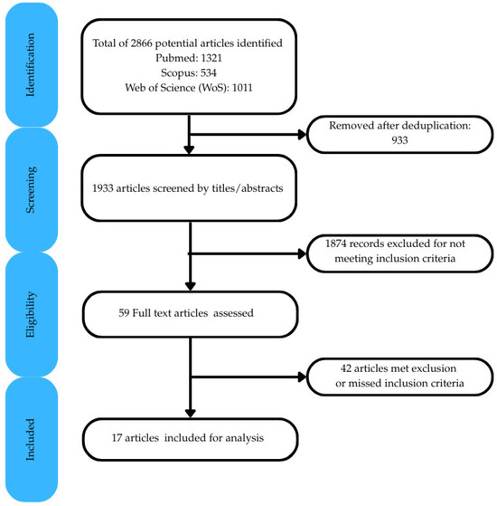A total of 2866 articles were identified through searches of PubMed, Scopus, and Web of Science databases. After removal of duplicates and title/abstract screening, 59 full-text articles were assessed for eligibility. Ultimately, 17 studies met the inclusion criteria and were included in this scoping review (Figure 1).