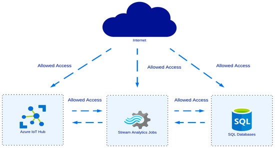 In a typical IoT Cloud deployment, data flows from edge devices (sensors or actuators) to centralized cloud services for further processing [5]. The Azure IoT architecture, for example, consists of services such as Azure IoT Hub for device communication, Stream Analytics for data processing, and Azure Structured Query Language Databases for storage [6,7]. Without proper security measures, each component becomes a potential vector for unauthorized access, data breaches, or denial-of-service attacks.