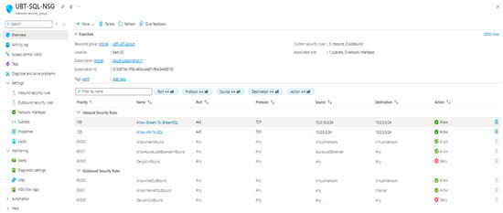And custom Route Tables that directed data flows along explicitly defined paths, thereby preventing unintended access across subnet boundaries (Figure 4). Custom route table enforcing communication control between subnets. NSG policies are shown in green, and VPN-based access is indicated by blue arrows. Data flows are directional, and restricted routes are blocked via firewall configurations.