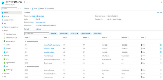 This study examines the performance and security dynamics of the IoT Cloud system implemented at UBT Smart City, focusing on the implications of introducing advanced cybersecurity mechanisms on system latency and operational efficiency. The infrastructure under analysis is deployed on Microsoft Azure and comprises core services including Azure IoT Hub for device connectivity, Stream Analytics for real-time data processing, Azure SQL Database for structured storage, and Azure Virtual Machines for administrative tasks [8,20,21]. These components are logically grouped within an Azure Virtual Network (VNet) that is further segmented into multiple subnets (e.g., IoTHubSubnet, STREAMSubnet, SQLSubnet, VMSubnet), each isolated through dedicated Network Security Groups (NSGs) to enforce granular traffic control policies.