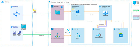 Management activities and administrative access to Azure VMs were strictly restricted through this VPN tunnel, while sensor data transmission to IoT Hub was limited to the public IP address space of UBT (Figure 6: Updated Logical Topology).