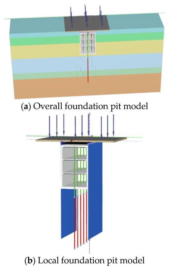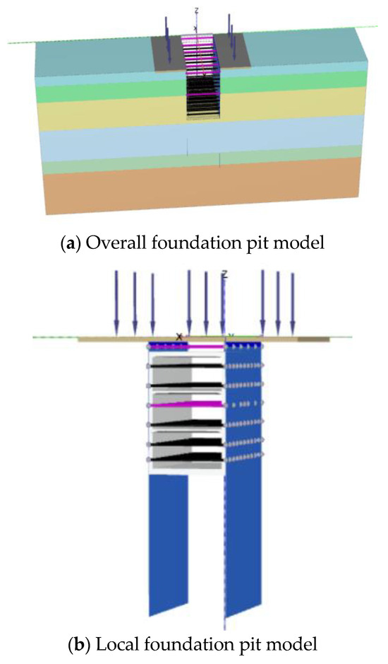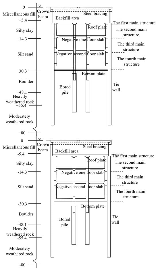 The construction of urban subway stations frequently occurs in densely populated areas. The excavation of foundation pits can lead to significant risks, including damage to existing subway tunnels, ground subsidence, structural damage to buildings, the uplift of diaphragm walls, and the failure of support systems [1,2,3,4,5,6,7,8]. The iterative update of subway construction methods has greatly promoted the rapid development of infrastructure. Farzi et al. [9] compared conventional and widely used methods; an appropriate and safe support system was proposed for excavation in urban areas depending on construction, structural, and economic conditions. Hsiung et al. [10] established a three-dimensional finite element model by considering a top-down construction method, a supporting system of concrete slabs, and the influence of the soil modulus. Bozkurt et al. [11] studied the influence of lime–cement stability on foundation pit support by using the finite element method. The 2D finite element analyses were performed with advanced constitutive models for both natural clay and stabilized soil, performing a laboratory test made on both field-mixed and laboratory-mixed stabilized clay samples. Russo et al. [12] carried out a 3D numerical simulation study of the Chiaia station of the Naples Metro Line 6 to predict and control the deformation of a deep foundation pit in order to safeguard the safety of the adjacent Basilica Santa Maria degli Angeli. Lin et al. [13] analyzed the similarities and differences in force and deformation between foundation pits excavated by the zonal method and those excavated by the conventional method.