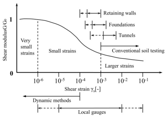 Characteristic stiffness–strain behavior on logarithmic scale.