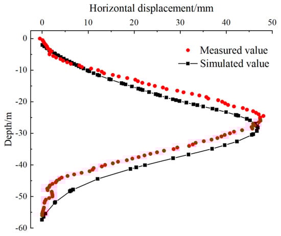 This study established a three-dimensional finite element model based on a foundation pit project at the Zhongyilu Station of the Wuhan Metro Line 12 to analyze the excavation process. In accordance with the actual project specifications, the model was divided into a total of 11 construction scenarios. The real excavation scenarios were simulated through the activation and passivation of elements within the model. The detailed excavation scenarios are presented in Table 4. Comparative analysis was conducted between the measured and simulated horizontal displacements of the diaphragm wall at the ZQT82 monitoring point of the K foundation pit. The results are illustrated in Figure 5. The simulated and measured horizontal displacements exhibited good agreement, demonstrating the applicability of the numerical model presented in this study.
