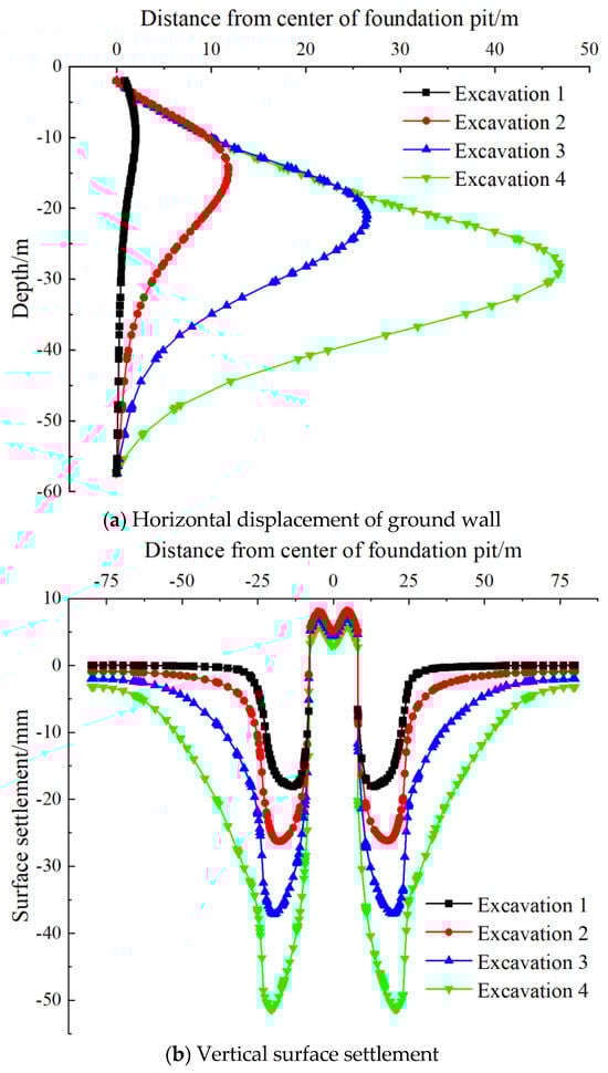 Figure 7b revealed that the ground surface settlement gradually increased as the foundation pit was excavated, which was consistent with the change trend of the diaphragm wall displacements. The main influence range of the ground surface settlement caused by excavation extended approximately 0 to 56 m away from the foundation pit boundary, corresponding to about twice the excavation depth. The secondary influence area spans approximately 56 to 75 m away from the boundary, which is about 2.7 times the excavation depth. The maximum ground surface settlements at different excavation stages were −18.11 mm, −26.29 mm, −37.14 mm, and −51.30 mm, respectively.