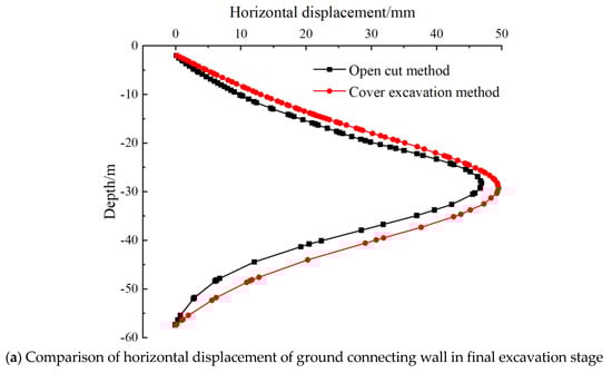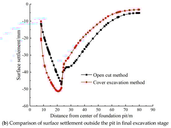 Figure 10 illustrates the horizontal displacement of the diaphragm wall and the ground surface settlement outside the pit for both the cut-and-cover method and the top-down method. As depicted in Figure 10a, the deformation patterns of the diaphragm wall resulting from both methods exhibited similarities, characterized by a “bow-shaped” pattern with pronounced deformation in the middle and small deformations at both sides. The maximum deformation of the diaphragm wall associated with the cut-and-cover method reached 49.35 mm, which was generally larger than that observed with the top-down method. This difference can be attributed to the fact that the top-down method uses the floor slab of the main structure as the support framework for the foundation pit. This configuration provided enhanced support stiffness compared to the cut-and-cover foundation pit, which relied on concrete and steel struts. Consequently, this increased stiffness exerted a damping effect on the inward movement of the diaphragm wall towards the pit. Therefore, in the context of this project, the top-down method demonstrated superior performance in controlling the deformation of the retaining structure compared to the cut-and-cover method. Further analysis of Figure 10b shows that the ground surface settlement associated with both construction methods tends to follow a typical “concave groove” shape. The maximum ground surface settlement caused by the cut-and-cover method reaches −48.19 mm, which is slightly smaller than the deformation produced by the top-down method. Analysis of the settlement curve indicated that, on the left side of the “concave groove” shape, the settlement resulting from the top-down method was larger than that of the cut-and-cover method. Conversely, on the right side of the “concave groove” shape, the settlement from the top-down method was smaller than that from the cut-and-cover method. This observation further supports the conclusion that the top-down method is superior to the cut-and-cover method in controlling the deformation of the surrounding environment.