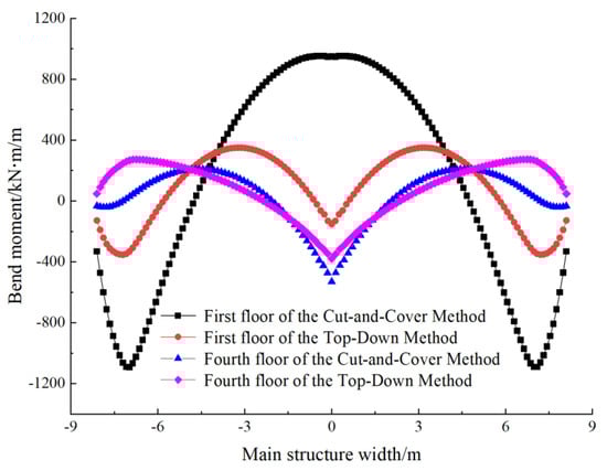 The bending moments of the main structure’s first floor and fourth floor for the cut-and-cover method and the top-down method during the final construction stage are shown in Figure 11. As can be seen from Figure 11, the maximum positive and negative bending moments of the first floor in the cut-and-cover method are much greater than those of the fourth floor of the cut-and-cover method and the first floor and fourth floor of the top-down method. They reach −1091.7 kN·m/m and 950.0 kN·m/m, respectively. This is mainly because, during the construction of the Cut-and-Cover method, the first floor of the main structure is the first to be constructed. The first floor serves as the first supporting structure of the cover excavation pit and bears most of the soil pressure during the subsequent excavation. As a result, the bending moment at the top plate of the main structure in the cut-and-cover method is the largest. Compared with the difference in bending moments between the first floor and fourth floor in the cut-and-cover method, the bending moments at the first floor and fourth floor in the top-down method are almost the same. This is because, when the main structure is poured in the top-down method, due to the effect of the internal support, the main structure and the internal support jointly bear the soil pressure, making the main structure more evenly stressed.