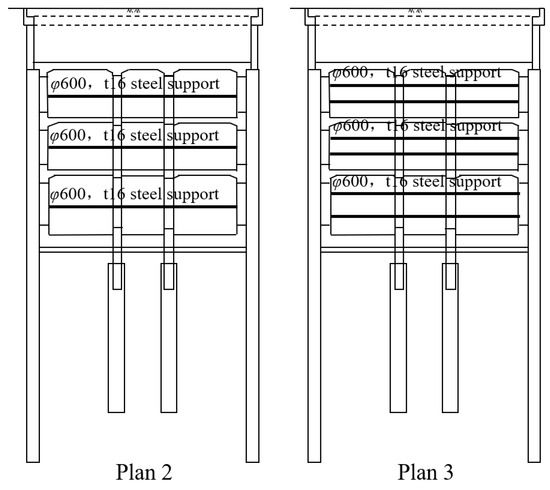 Due to its unique construction process, the top-down method significantly reduces the duration of road closure associated with construction activities and offers the advantage of rapidly restoring traffic flow. As discussed in Section 3, the top-down method demonstrates superior capabilities compared to the cut-and-cover method in terms of controlling foundation pit deformation and minimizing the impact of construction on the surrounding environment. In practical applications of the top-down method, the roof or floor slab of the main structure functions as a structure element that resists deformation. Analysis in Section 3.4 reveals that the roof or floor slab of the main structure experiences minimal deformation during construction, which effectively restricts the deformation of the diaphragm wall located above the floor slab. Given that this project features a maximum storey height of 9 m, there would inevitably be extended periods without support during the excavation of subsequent foundation pit layers. This condition could lead to the excessive deformation of the retaining structure beneath the foundation pit floor slab, as shown beneath in Figure 7a. Consequently, the deformation associated with the top-down method may not satisfy the requirements imposed in regions that necessitate strict deformation control. In this study, during the top-down construction process, each excavation height was reduced, and a construction method involving segmental pouring of the main structure, along with the addition of internal supports, was implemented, as shown in Figure 12. Plan 2, depicted on the left side of Figure 12, incorporates one steel support between each floor slab. Plan 3, presented on the right side of Figure 12, includes two steel supports between each floor slab. This method meets the functional requirements of structural deformation control while also taking economy into account. All internal supports utilize ordinary pre-stressed steel supports with specifications of φ609 mm × 16 mm. They have a horizontal spacing of 3 m and a pre-stress of 300 kN. Comparing the new schemes with the original construction method facilitates a discussion of their advantages in controlling the deformation of the retaining structure, the vertical displacement of the ground surface, and the differential settlement between the diaphragm wall and the lattice columns.