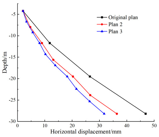 Figure 13 presents a line chart illustrating the maximum deformation points of the diaphragm wall under the three different excavation schemes as a function of excavation depth. As indicated in Figure 13, the maximum horizontal displacements of the diaphragm walls for all three excavation schemes gradually increased with the excavation depth. Plan 3 exhibited the lowest growth rate of the maximum horizontal displacement, with a final maximum displacement of only 31.71 mm, which equated to 0.15% H. Plan 2 provided the second-best deformation control, with a maximum displacement of 36.35 mm at the final excavation sequence, which equated to 0.17% H. The original scheme demonstrated the least effective deformation control. Compared to the excavation method of the original scheme, Plan 3 reduced the maximum horizontal displacement of the diaphragm wall by 15.18 mm, representing a decrease of approximately 32.37%. Meanwhile, Plan 2 achieved a reduction of 10.54 mm, corresponding to a decrease of approximately 22.47%.
