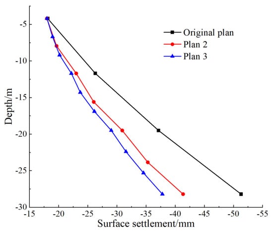 Figure 14 presents a line chart illustrating the maximum ground surface settlement points of the foundation pit at different excavation depths. A comparison with Figure 13 indicated the existence of consistent variation trends in the horizontal displacement of the diaphragm wall and the ground surface settlement. Plan 3 exhibited the best deformation control, with a maximum ground surface settlement of −37.81 mm after excavation. Plan 2 provided the second-best performance, with a maximum ground surface settlement of −41.55 mm, while the original scheme demonstrated the least effective deformation control. Compared to the excavation method of the original scheme, Plan 3 reduced the maximum ground surface settlement by 13.49 mm (approximately 26.29%), and Plan 2 achieved a reduction of 9.75 mm (about 19.01%). Furthermore, the analysis of diaphragm wall deformation revealed that the range horizontal displacement was consistently greater than the ground surface settlement under the same construction scheme. This observation indicated that the diaphragm wall deformation is more sensitive to the construction scheme than the ground surface settlement. Compared with Plan 2, the maximum horizontal displacement of Plan 3 is reduced by 4.64 mm, or 12.76%. The deformation control effect does not increase significantly.