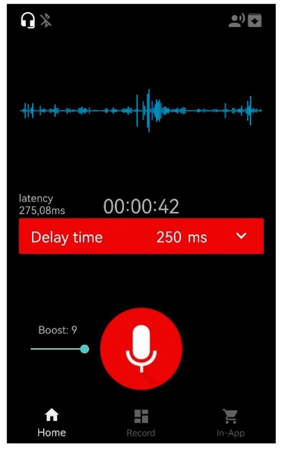 Delay simulation was performed using the DAF application, which allows fine-tuning of the desired delay. This application has the ability to set the delay and record the progress (Figure 2). By its accessibility, it was decided to use this application, as anyone interested in the DAF effect can use it anywhere. Because of its simplicity of use, it is an ideal tool for working on self-improvement in both the level of correctness and intelligibility of speech. After pressing a button, the application starts its work, and everything the user says is repeated after a certain pre-selected time. Each user has the ability to record his or her speech, which is later transferred to a library of recordings, which makes it possible to analyze speech and decide what still needs to be worked on. An additional feature of the application is the ability to record sessions, which allows for later analysis of progress.