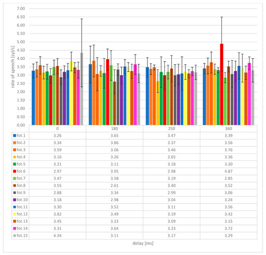 In summarizing the collected data, it can be concluded that DAF influences healthy individuals by slowing their speech and requiring greater focus when articulating subsequent words. The authors paid special attention to the results of multiple parameters, as they highlighted the participants’ susceptibility to delays. Observations suggest that the DAF effect significantly impacts the speech tempo and reading time, which could be relevant for speech therapy aimed at improving the articulation of both healthy individuals and those with disfluencies. This paper introduces a novelty by applying DAF in healthy individuals with specific speech parameters. The proposed approach improves the understanding of speech pathologies and may contribute to more effective therapeutic interventions within the target research field.