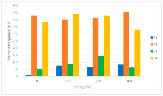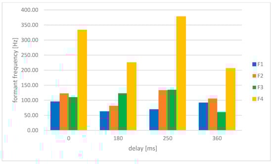 DAF-induced delays influence the pitch of the women, causing a reduction in frequency at higher delay values. At a delay of 360 ms, all vowels exhibited a decrease in pitch, which may indicate difficulties in maintaining controlled voice production under the maximum delay conditions. The 180 ms delay appeared to have the least impact on the pitch, suggesting it may represent a threshold value where the DAF effect on voice remains minimal.