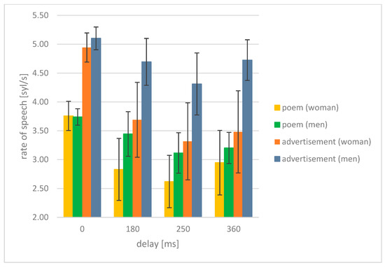 Both female and male participants demonstrated a decrease in speech tempo as the delay increased. The highest average speech tempo was observed under natural speech conditions (0 ms delay), while the lowest occurred at the maximum delay (360 ms). The women exhibited generally slower speech rates compared to the men across all delay conditions, which may suggest differences in adaptive strategies or sensitivity to DAF. The men showed less variability in speech tempo across the different delay conditions, indicating greater stability in coping with delayed auditory feedback.