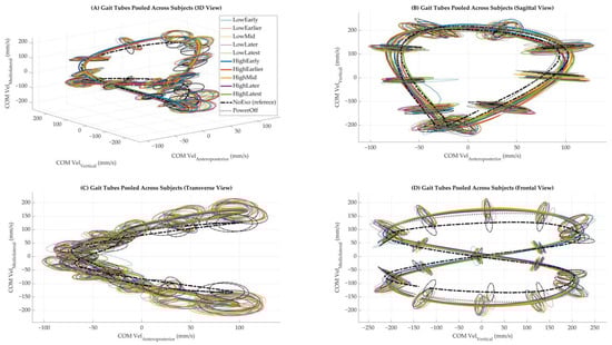 Gait tubes were visualized from multiple perspectives: 3D (Vx, Vy, Vz), sagittal (Vx vs. Vy), transverse (Vx vs. Vz), and frontal (Vy vs. Vz), as shown in Figure 1. The mean ellipsoid volume was computed over the entire gait cycle for each condition to enable global comparisons. Direction-specific variability was quantified by calculating the stride-to-stride standard deviation of COM velocity in the ML, AP, and VT directions. A total variability index was defined as the sum of these directional variances. At each normalized time point in the gait cycle (0–100%), all valid strides across participants within a given condition were aligned in time. The COM velocity vectors (Vx, Vy, Vz) at each time point were assembled into a data matrix, and a 3 × 3 covariance matrix was computed using standard covariance estimation: