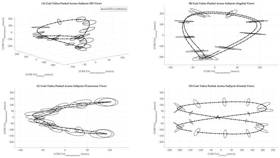 Gait tubes were pooled across subjects under NoExo walking condition. (A) Three-dimensional view of the center of mass (COM) velocity trajectories in velocity state space. (B) Sagittal view showing COM vertical versus anteroposterior components. (C) Transverse view showing COM mediolateral versus anteroposterior components. (D) The frontal view shows COM mediolateral versus vertical components. The NoExo condition is shown as a bold dashed line. Ellipsoids were computed at each gait phase and plotted to represent local variability in COM velocity across strides.