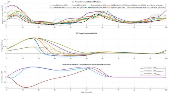 Phase-specific ellipsoid volumes confirmed that variability evolved dynamically over the gait cycle and was modulated by the exoskeleton’s torque assistance profile (Figure 3A). Most powered conditions exhibited elevated variability during early and mid-stance phases (10–50% of the gait cycle) compared to NoExo. For instance, HighLater and HighLatest showed prominent peaks in ellipsoid volume between 10 and 50%, corresponding to their respective torque profiles (Figure 3B). Statistical significance (Wilcoxon signed-rank test) was indicated by p-values in the legend, with significant differences from NoExo observed for most powered conditions (p < 0.05). Ground reaction force (GRF) trajectories, normalized to body weight, remained consistent across conditions in the anteroposterior, mediolateral, and vertical directions (Figure 3C), suggesting that changes in variability were not driven by altered external loading but rather by the exoskeleton’s assistive torque.