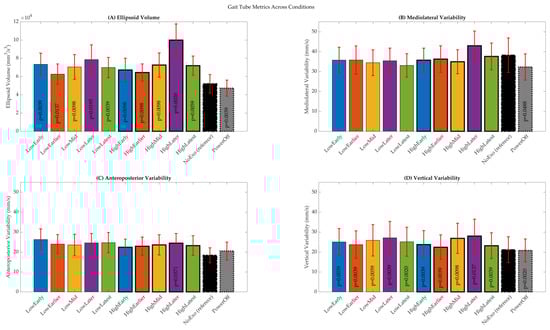 Summary of gait tube metrics averaged across the gait cycle. (A) Mean ellipsoid volume. (B) Mediolateral variability. (C) Anteroposterior variability. (D) Vertical variability. Bars represent condition-wise means across subjects, and error bars indicate standard deviations. Statistical significance is determined using Wilcoxon signed-rank tests relative to the NoExo condition.