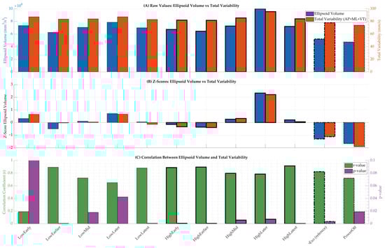 Z-scores and Pearson correlation coefficients were calculated between ellipsoid volume and total variability (sum of ML, AP, and VT variances) to evaluate the alignment between multidimensional and univariate variability measures. Z-scores were positive in most powered trials, indicating increased variability relative to NoExo (Figure 5B). Correlation analysis revealed strong associations (r ≥ 0.65, p < 0.05) between ellipsoid volume and total variability in all but one powered condition, with the strongest relationship observed in HighLatest (r = 0.91, p = 0.0002) (Figure 5C). These results confirm that ellipsoid volume is a robust surrogate for summarizing total variability under varying assistance conditions. Figure 5A presents raw values of ellipsoid volume and total variability, while Figure 5B and Figure 4C show z-scores and correlation coefficients, respectively, with dashed bars indicating reference conditions (NoExo and PowerOff).
