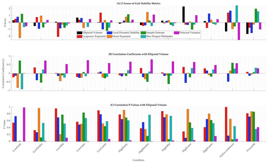To further elucidate the impact of hip exoskeleton assistance on multidimensional gait stability, z-scores and correlations of additional stability metrics were analyzed across all conditions (Figure 6). Figure 6A presents the z-scores of seven gait stability metrics—ellipsoid volume, Lyapunov exponent, local dynamic stability, Hurst exponent, sample entropy, maximum Floquet multiplier, and Poincaré variance—relative to the NoExo condition, revealing that powered conditions like HighLater and HighLatest exhibited distinct variability patterns, with z-scores peaking for ellipsoid volume in HighLater (z = 2.33) and for local dynamic stability in HighLatest (z = 1.30). Figure 6B,C display the correlation coefficients (r) and corresponding p-values between ellipsoid volume and the other six metrics, demonstrating varied relationships across conditions; for instance, the correlation for Lyapunov exponent in HighLatest was moderate (r = 0.29, p = 0.41), and for sample entropy in HighLater, it was weakly negative (r = −0.21, p = 0.55), indicating that these relationships were not statistically significant and highlighting the complexity of stability interactions under exoskeleton assistance.