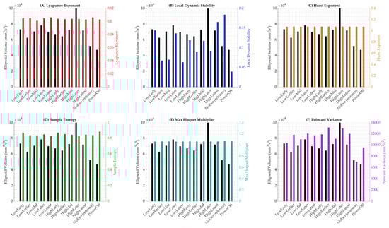 Raw values of gait stability metrics compared to ellipsoid volume across twelve walking conditions. Each subplot displays ellipsoid volume (left y-axis) alongside a secondary stability metric (right y-axis), allowing for visual comparison of condition-specific trends. (A) Lyapunov exponent. (B) Local dynamic stability. (C) Hurst exponent. (D) Sample entropy. (E) Maximum Floquet multiplier. (F) Poincaré variance.