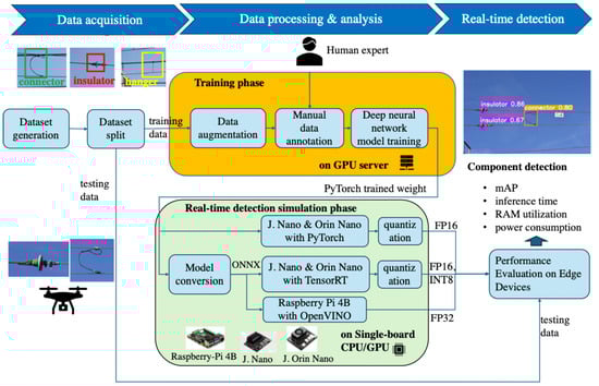 In our study, we develop a power transmission line inspection system using edge computing platforms [22]. The developed deep learning framework for this research is shown in Figure 3. It primarily consists of two stages, which are the training phase and the real-time detection phase. In the training phase, the data generation, data annotation, and training are conducted. In this study, YOLOv7 and Tiny YOLOv7 are trained. Both are state-of-the-art methods for the object detection task. In the real-time detection phase, the trained model is evaluated on edge computing devices, which are Raspberry Pi 4B, Jetson Nano, and Jetson Orin Nano. The specification of each device is defined in Table 12. Some deep learning frameworks are also evaluated in this research, i.e., OpenVINO 2023.1.0, PyTorch 2.1.2, and TensorRT 8.2.1. The model quantization to FP16 and INT8 are also evaluated in this research. Finally, the final evaluation results are the mAP, inference time, RAM utilization, and power consumption.
