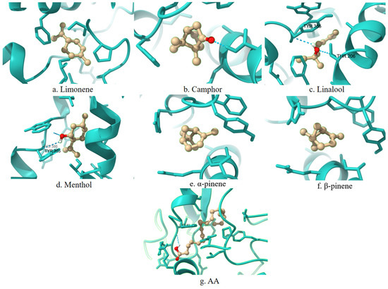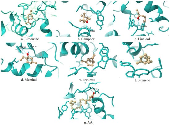 Among all studied terpenes, the highest torsional energy is observed for linalool (+1.49 kcal/mol) and AA (+4.47 kcal/mol), indicating greater molecular flexibility. In contrast, α-pinene and β-pinene exhibit zero torsional energy (+0.00 kcal/mol), suggesting conformational stability upon binding.