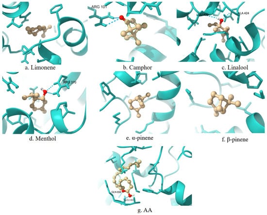 The interaction parameters of the selected terpenes with COX-2, compared to AA, are summarized in Table 2.