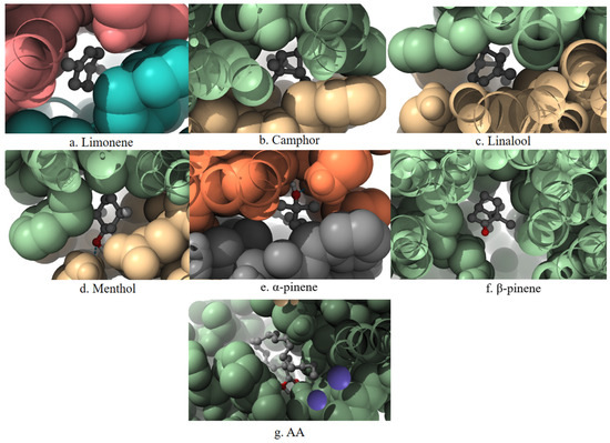 A 3D visualization of the interactions between the terpenes, AA, and the PLA2 enzyme is presented in Figure 4. Ligands are shown in the ball-and-stick format, surrounded by a space-filling surface representation of the protein to illustrate spatial accommodation and surface contact. The visualization highlights the degree of penetration and positioning of each ligand within the catalytic pocket of PLA2.