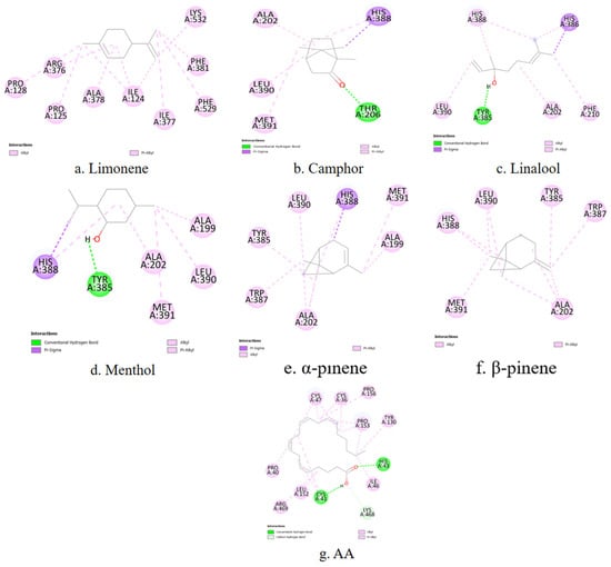 AA exhibits the lowest binding energy (−7.07 kcal/mol), indicating strong interaction with COX-2. Among the analyzed terpenes, camphor has the lowest binding energy (−6.48 kcal/mol), followed by menthol (−6.42 kcal/mol).