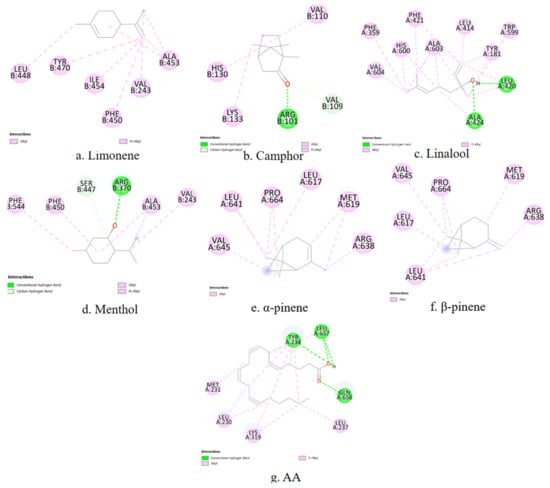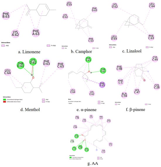 Limonene (−5.57 kcal/mol), menthol (−5.45 kcal/mol), and AA (−5.45 kcal/mol) exhibit the lowest binding energies, indicating stable interactions with 5-LOX. The remaining terpenes also demonstrate relatively favorable binding energies, with camphor displaying the highest value (−5.17 kcal/mol), which may suggest weaker interaction with the enzyme.