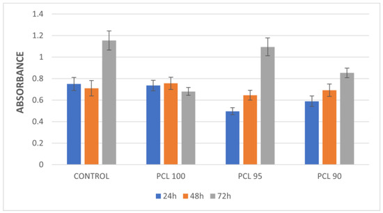 After analyzing the results obtained in the cell viability assay (MTT), no significant differences were found between the materials; the results for the different samples according to absorbance and elapsed time were very similar, giving rise to values that were well above p < 0.05. The p-value delimits whether there are significant differences between samples. The results obtained in terms of absorbance according to the concentration of PCL turned out to be p = 0.6217, and according to the absorbance and number of hours elapsed, p = 0.2019, so the differences were not considered significant. These results were compared with each other and with the control group, guaranteeing that the materials under study did not cause any cell damage to the cultures apart from that which occurred in the control.