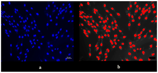 2, and 95% humidity, 100 μL was removed from the culture medium, and the cells were fixed by adding 100 μL of Casnoy’s fixative solution (3/1 proportion of absolute methanol and glacial acetic acid) for 5 min. After 5 min, the medium and fixative were removed from the wells. Next, 200 μL of fixative solution was added to each well, and we waited for 10 min. The fixative solution was removed and allowed to air dry for 30–60 min. Once fixed and dry, in dark conditions in the cabin, 200 μL of Hoechst solution with a concentration of 1 μg/mL in PBS was added. They were incubated in darkness at room temperature for 20–30 min (the plate was covered with aluminum foil). After some time, the coloring substance was removed and washed 3 times with distilled water. The excess water was left to dry in the air. The sample was taken to a Nikon Eclipse TE2000-U inverted microscope at a 50 μm scale for cell counting using 3 photographs of each well, ensuring that there were at least 200 stained cores per well.