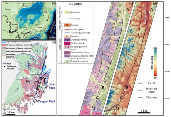 The regional geological framework (Figure 1b) is based on the geological maps from [25,26], showing a distribution of Mesozoic to Cenozoic volcanic, plutonic, and sedimentary rocks dissected by the Yangsan and Ulsan Fault systems. The Yangsan Fault, in particular, cuts across Late Cretaceous to Paleogene rock units, indicating a long-lived and complex deformation history.