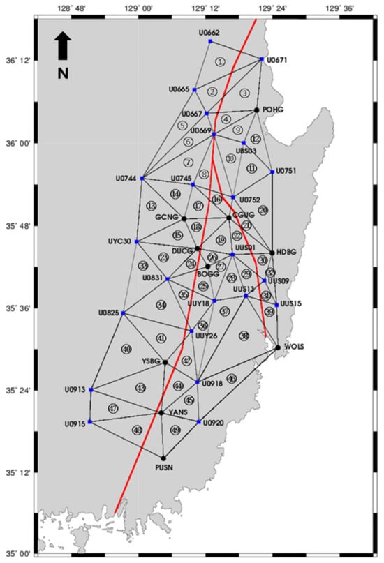 In this study, a total of 49 non-overlapping triangles were constructed using 33 GNSS stations—23 from the national Continuously Operating Reference Station (CORS) network and 10 additional campaign-mode sites. This configuration ensures dense spatial coverage across the southeastern Korean Peninsula, particularly near major fault systems.