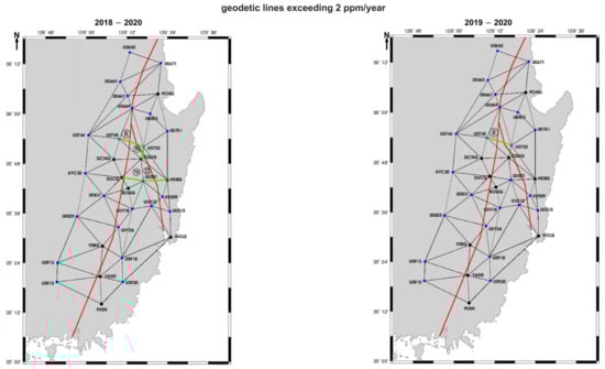 To highlight zones of significant deformation, geodetic lines exhibiting strain rates exceeding 2 ppm/year were extracted and visualized (Figure 3). The maps compare two consecutive observation periods (2018–2020 and 2019–2020), allowing for the identification of spatial and temporal variations in strain concentration. These high-strain-rate baselines were identified and flagged for subsequent spatial analysis, focusing on the central segment of the Yangsan Fault where concentrated strain values were observed.