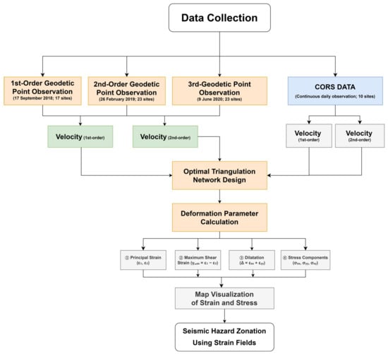 Figure 4 illustrates the comprehensive workflow adopted in this study to assess seismic hazards through GNSS-derived strain field analysis. The process begins with three discrete geodetic campaign surveys (1st-, 2nd-, and 3rd-order observations) and continuous CORS (Continuously Operating Reference Stations) data collection. These datasets are used to compute horizontal velocity vectors, which serve as the basis for constructing an optimized triangulated geodetic network.