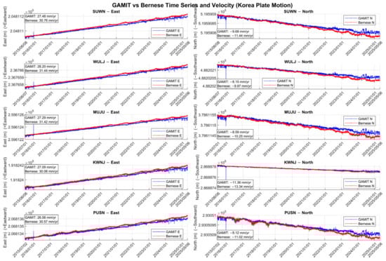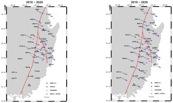 Based on this processing framework, the present study computed the satellite-based displacement of five continuously operating reference stations over a ten-year period. As described in Section 3.1, the derived results were compared against the tectonic velocity models of ITRF2020, GSRM v2.1, and APKIM2005-IGN.