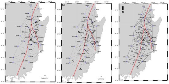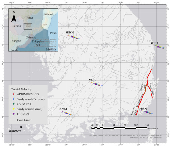 - Lee, S.; Yoon, H. Analysis of Crustal Deformation Parameters in the Southeastern Region of the Korean Peninsula Using GNSS. J. Korean Soc. Surv. Geod. Photogramm. Cartogr. 2020, 38, 697–705. [Google Scholar] [CrossRef]