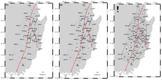 To further assess crustal strain across active fault systems, two triangulated GNSS networks were established for comparative analysis. In the first case, 32 triangular elements were constructed by connecting 6 satellite control stations and 17 integrated geodetic control points from the 2020 and 2018 datasets. In the second, a denser network of 49 triangles was created using 10 satellite stations and 23 control points. For both configurations, all baselines were converted to geodesic lines prior to strain computation, and baseline strains were calculated for east–west-oriented segments that intersect major fault zones. These two network resolutions enabled a multi-scale assessment of deformation patterns and spatially variable strain accumulation across the southeastern Korean Peninsula.