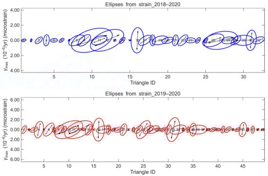 For tectonic interpretation, the principal strain components ε1 and ε2 are obtained as eigenvalues of the strain tensor, with corresponding eigenvectors indicating the directions of maximum and minimum strain. The maximum shear strain is computed as follows: