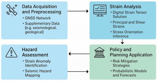 Conceptual framework for integrating GNSS-based strain analysis into seismic hazard assessment and policy planning. The process begins with data acquisition and preprocessing, utilizing GNSS network observations alongside supplementary geological and seismological datasets. This is followed by strain analysis, where digital strain tensor solutions are derived to extract principal and maximum shear strains and infer regional stress orientations. In the hazard assessment phase, anomalies in strain patterns are identified and mapped to delineate zones of elevated seismic risk. Finally, outputs feed into policy and planning applications, enabling the formulation of risk mitigation strategies and the development of probabilistic seismic hazard models and forecasts (PSHM). This framework highlights a multidisciplinary approach that enhances the reliability and applicability of strain-based assessments in tectonically active yet low-seismicity intraplate regions.