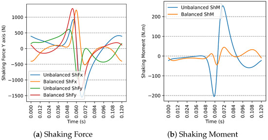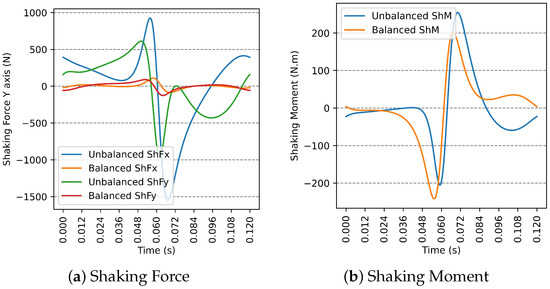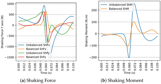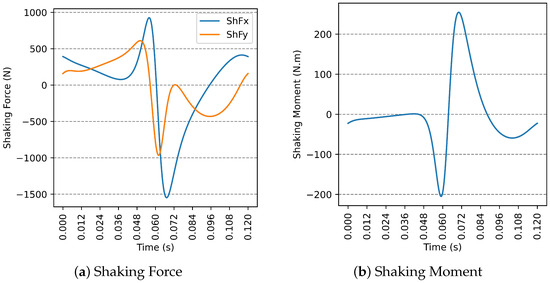 Figure A1 displays the shaking force (ShF) and shaking moment (ShM) obtained with this solution. Compared with the balanced-mechanism response shown in Figure 9, the two curves are virtually indistinguishable.